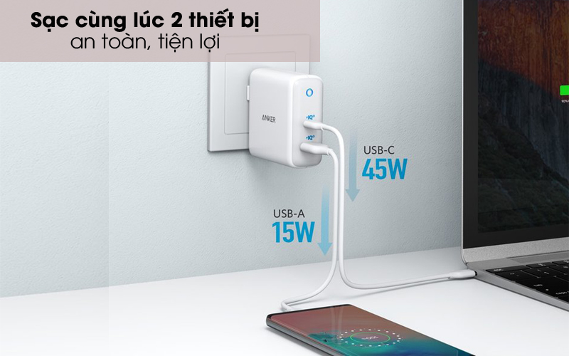 Tổng cổng suất 60 W được phân phối thông mih qua 2 cổng sạc trên sạc Anker để bạn cùng lúc sạc 2 thiết bị, tiết kiệm thời gian và không gian làm việc của bạn.