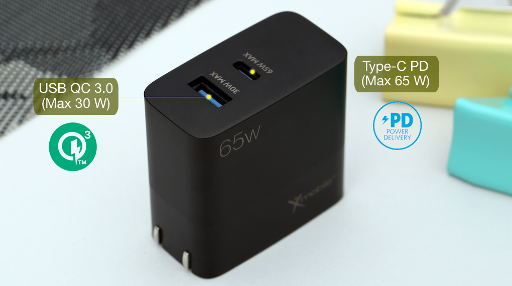 Cổng Type-C có công nghệ Power Delivery hỗ trợ dòng sạc tối đa lên đến 65 W có thể dùng sạc pin cho cả laptop, máy tính bảng với dòng sạc đa dạng bao gồm 5V - 3A, 9V - 3A, 12V - 3A, 15V - 3A, 20V - 3.25A. Cổng USB Quick Charge 3.0 hỗ trợ sạc 4.5V - 5A, 5V - 4.5A, 9V - 3A, 12V - 2.5A, 20V - 1.5A với dòng sạc tối đa 30 W.