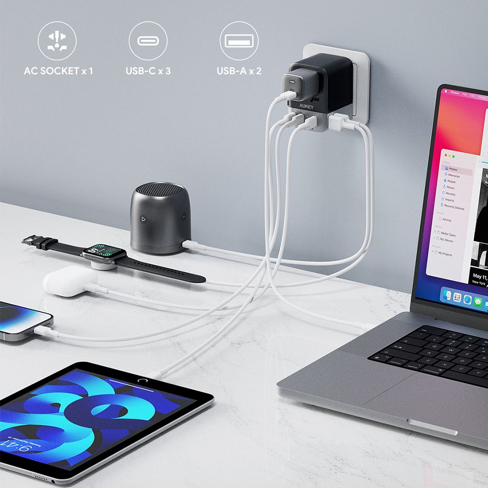 Sở hữu đến 5 cổng sạc, bao gồm 3 cổng USB Type-C và 2 cổng USB Type-A, sản phẩm cho phép bạn thoải mái sạc cùng lúc nhiều thiết bị. Dù là điện thoại, máy tính bảng hay tai nghe, bạn đều có thể kết nối và sạc một cách nhanh chóng và hiệu quả. Khi sử dụng nhiều cổng cùng lúc, mỗi cổng USB Type C2/C3/A4/A5 vẫn đảm bảo dòng sạc 5V - 2.4A, công suất tối đa 15W cho mỗi cổng, giúp mọi thiết bị của bạn luôn tràn đầy năng lượng.