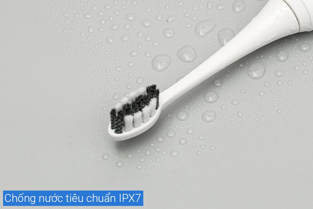 - Bàn chải điện đạt chuẩn chống nước IPX7, cho phép rửa trực tiếp dưới vòi nước hoặc sử dụng an toàn trong điều kiện ẩm như phòng tắm.