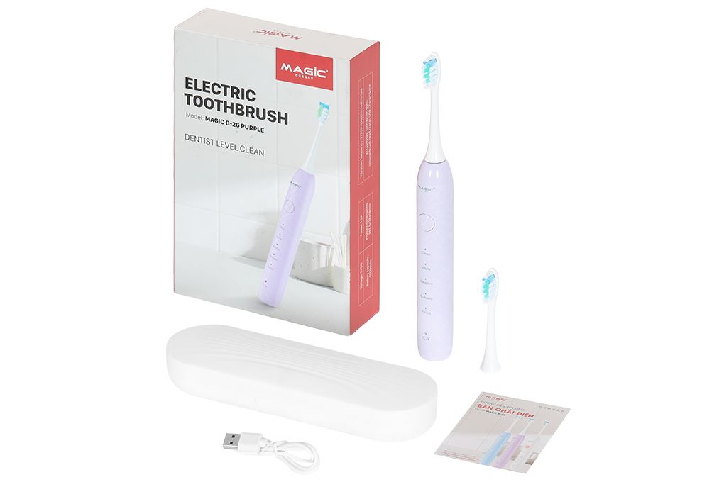 Magic B-26 - Tím phù hợp với người muốn nâng cấp thói quen chăm sóc răng miệng theo hướng gọn, sạch nhanh và tiện theo dõi. Điểm mạnh nằm ở tần số rung cao 40.000 nhịp/phút, 5 mức độ dễ tùy chỉnh và pin dùng lâu, sạc Type-C tiện cho sinh hoạt hằng ngày.