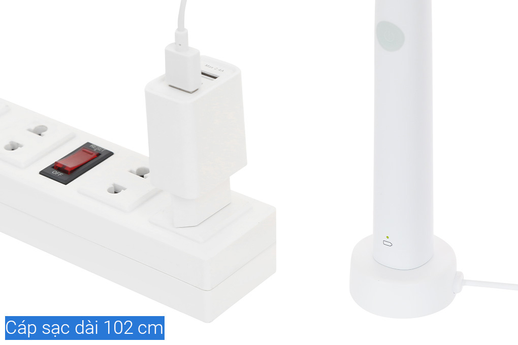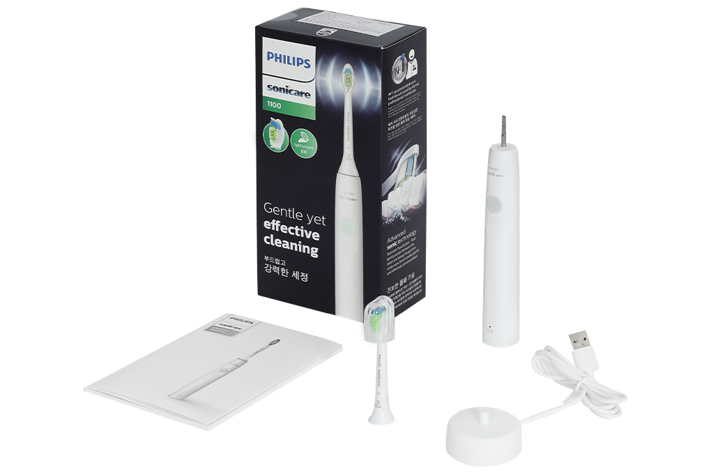 - Phụ kiện đi kèm gồm thân máy, 1 đầu bàn chải và đế sạc không dây gọn nhẹ.
