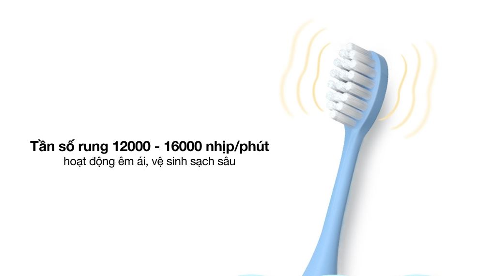 Bàn chải điện được trang bị động cơ công suất 1W cùng tần số rung nhẹ nhàng từ 12000 - 16000 nhịp/phút hỗ trợ làm sạch răng hiệu quả mà vẫn êm ái, không gây khó chịu cho bé. Nhờ khả năng loại bỏ thức ăn thừa và mảng bám nhẹ trong kẽ răng, sản phẩm góp phần ngăn ngừa sâu răng, giữ cho răng miệng luôn sạch sẽ và khỏe mạnh mỗi ngày.