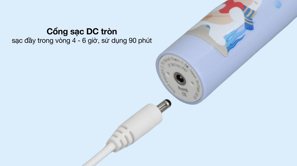 - Bàn chải đánh răng điện trẻ em được trang bị pin dung lượng 500 mAh, cho phép sử dụng liên tục lên tới 90 phút.