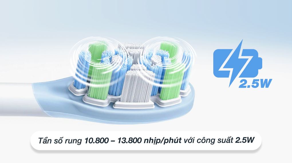 Bàn chải tạo ra lực làm sạch sâu, đánh bật mảng bám và cặn thức ăn bám trên răng nhờ sở hữu tần số rung 10.800 – 13.800 nhịp mỗi phút cùng công suất 2.5W. Sau mỗi lần sử dụng, khoang miệng trở nên thoáng đãng và hơi thở thêm phần tự tin.