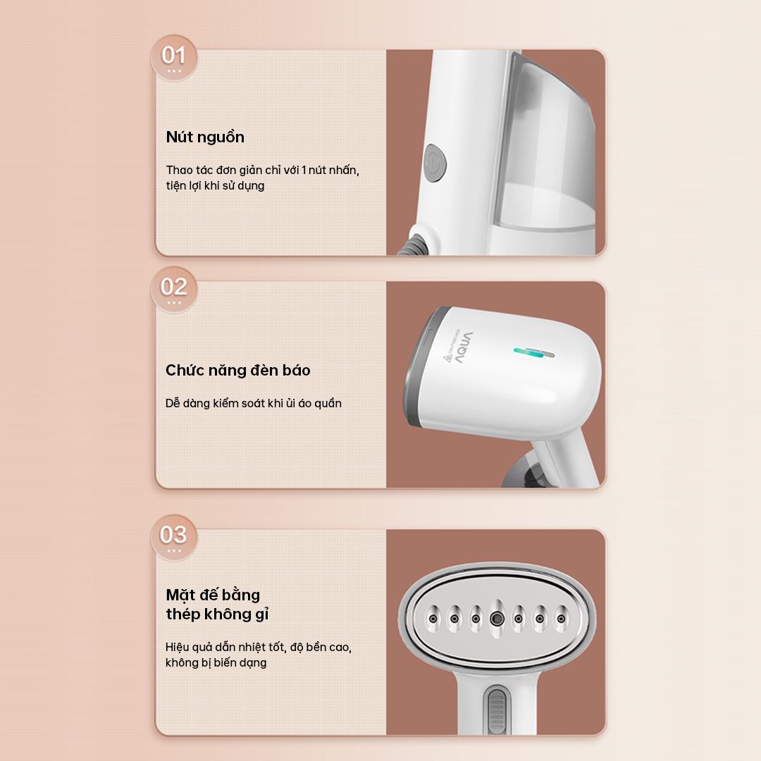 Bàn ủi hơi nước cầm tay AQUA sở hữu thiết kế màu trắng tinh tế, gọn nhẹ chỉ 0.98 kg và kích thước ngang 10 cm, cao 22.7 cm, sâu 14.5 cm, dễ dàng mang theo mọi nơi. Điểm nổi bật là khả năng kết hợp ủi quần áo treo và ủi nằm, mang lại sự linh hoạt tối đa khi sử dụng. Dù có dây điện dài 160 cm, thiết kế cầm tay vẫn đảm bảo sự tiện lợi.