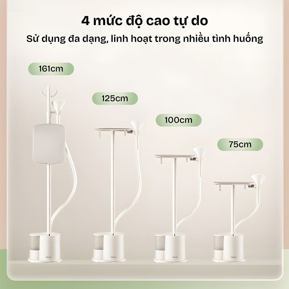 Với thiết kế 1 trụ ủi chắc chắn bằng kim loại, bạn có thể linh hoạt điều chỉnh chiều cao qua 4 mức 75 - 100 - 125 - 161 cm, phù hợp với vóc dáng và tư thế ủi của nhiều người dùng.