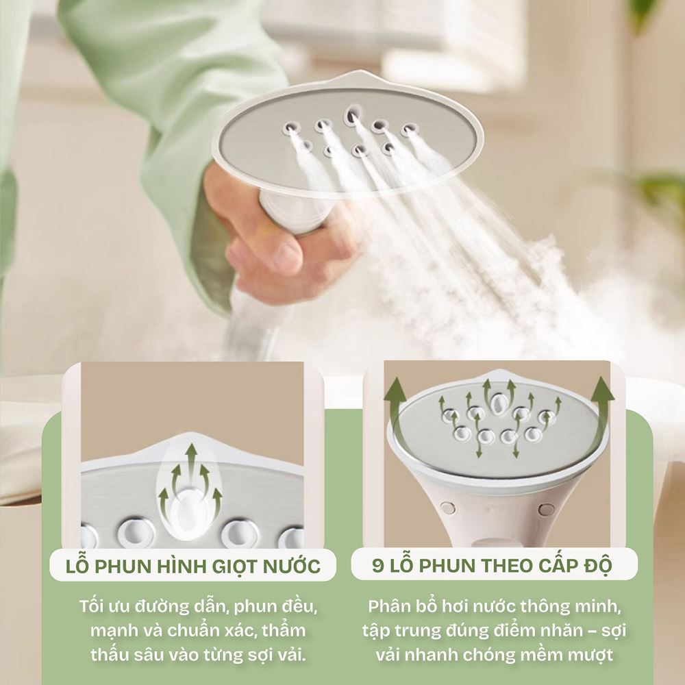 Thiết kế lỗ phun hình giọt nước đặc biệt tối ưu đường dẫn hơi, đảm bảo hơi được phun ra đều, mạnh và chuẩn xác, thấm sâu vào từng sợi vải, làm mềm các nếp nhăn một cách hiệu quả. Hệ thống 9 lỗ phun theo cấp độ còn giúp phân bổ hơi nước đồng đều, tập trung đúng điểm nhăn, mang lại những bộ quần áo mềm mại và phẳng phiu chỉ sau vài đường lướt.