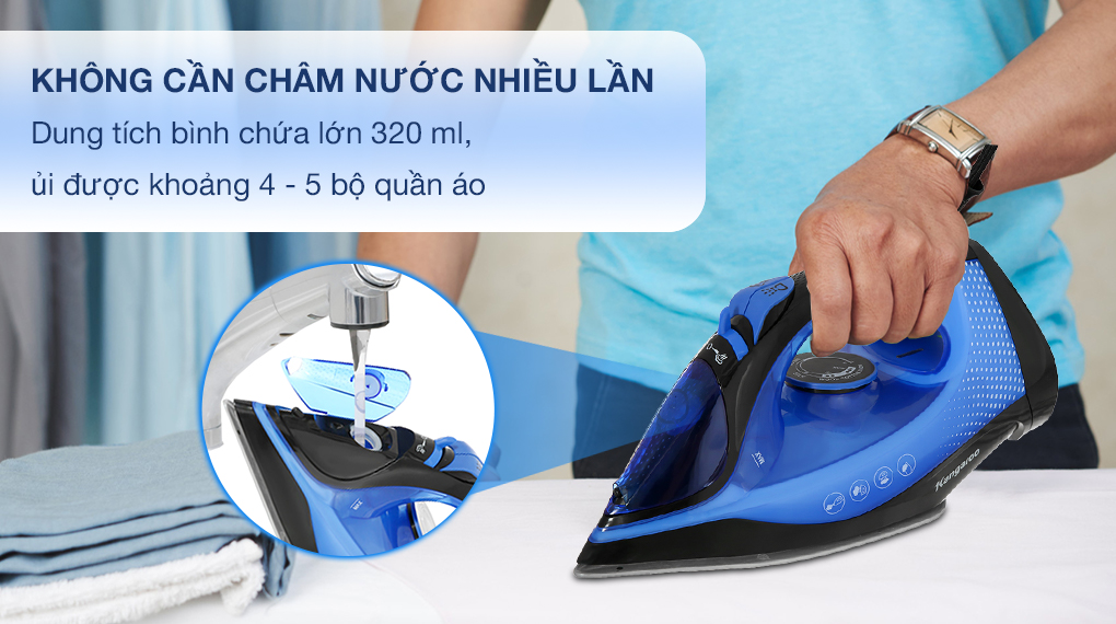 • Dung tích bình nước 320 ml, ủi nhiều quần áo hơn, khoảng 4 - 5 bộ quần áo.