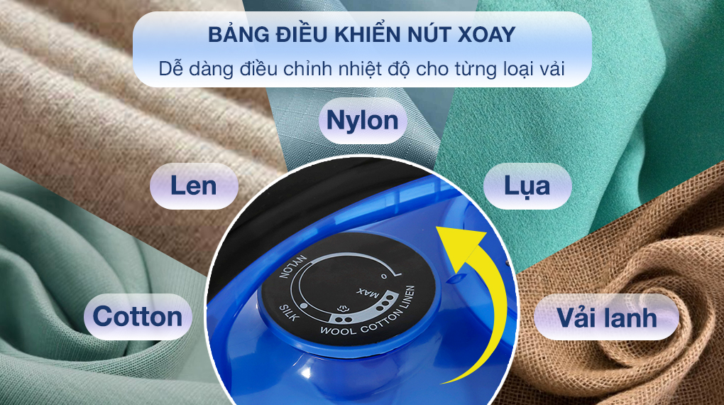 - Bảng điều khiển nút xoay với ngôn ngữ tiếng Anh giúp bạn có thể tùy chỉnh nhiệt độ cho từng loại vải: nylon, cotton, lanh, lụa, len để ủi quần áo thuận tiện hơn.