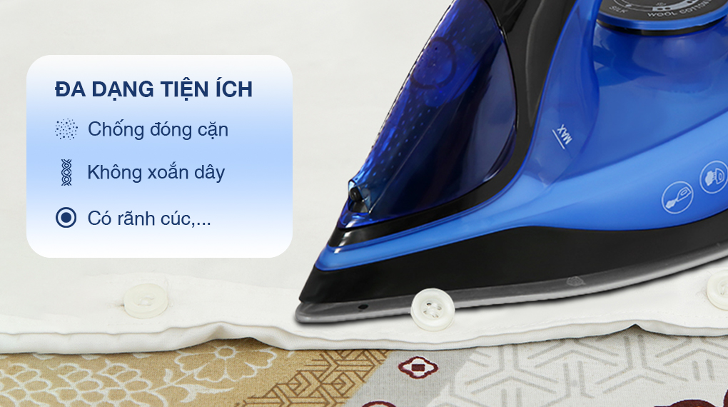 Bàn ủi hơi nước đa chức năng tiện dụng bao gồm: ủi khô, ủi hơi nước, phun tia, ngoài ra khi đối mặt với những nếp nhăn cứng đầu, chế độ phun hơi là giải pháp hữu hiệu không thể thiếu. Việc tăng cường phun hơi giúp làm ẩm và mềm vải, khiến cho việc ủi phẳng nếp nhăn dễ dàng hơn rất nhiều, giảm tải được đáng kể thời gian và công sức là ủi.