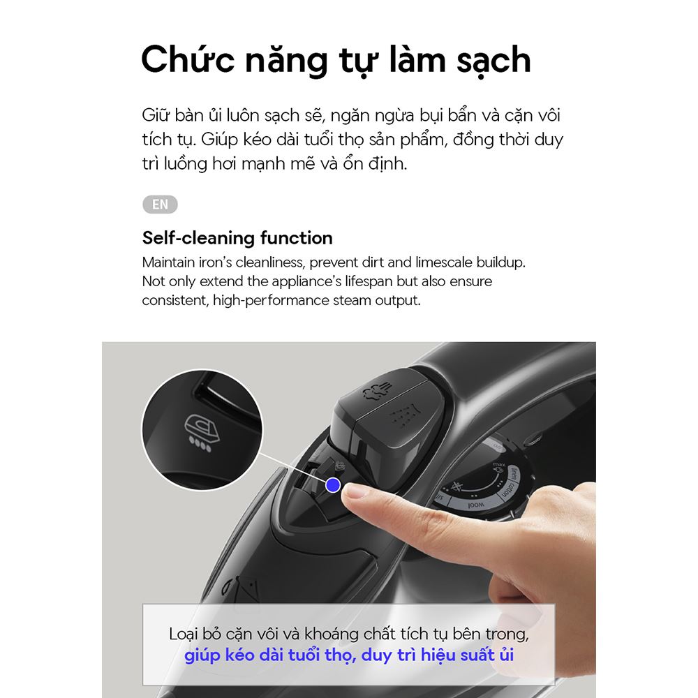 Để đảm bảo bàn là luôn hoạt động hiệu quả và kéo dài tuổi thọ, Lock&Lock ENI334BLK được trang bị chức năng tự làm sạch cặn. Tính năng này giúp ngăn ngừa bụi bẩn và cặn vôi tích tụ bên trong, duy trì luồng hơi mạnh mẽ và ổn định. Đồng thời, bộ lọc tích hợp trong bình chứa nước còn có tác dụng làm mềm nước cứng, hạn chế cặn bám trên mặt đế, giữ cho thiết bị luôn bền bỉ và hoạt động ở hiệu suất cao nhất.