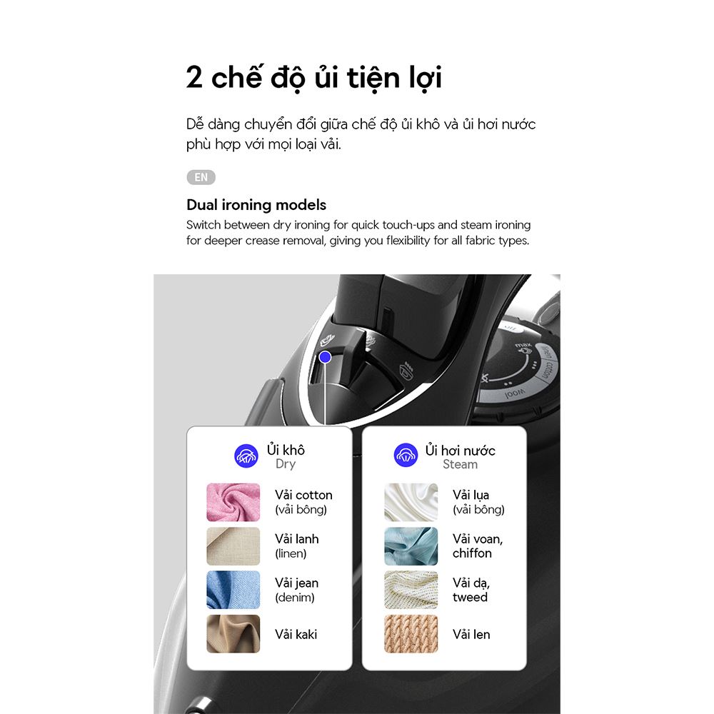 Sản phẩm tích hợp hai chế độ ủi tiện lợi là ủi khô và ủi hơi nước, cho phép bạn dễ dàng chuyển đổi để phù hợp với mọi loại chất liệu vải. Bạn có thể tùy chỉnh mức nhiệt độ một cách linh hoạt, đảm bảo an toàn cho từng loại vải và đạt được hiệu quả là phẳng tối ưu. Thiết kế hướng tia nước chính xác vào vị trí cần thiết, giúp làm mềm vải và đẩy nhanh quá trình làm phẳng nếp nhăn.