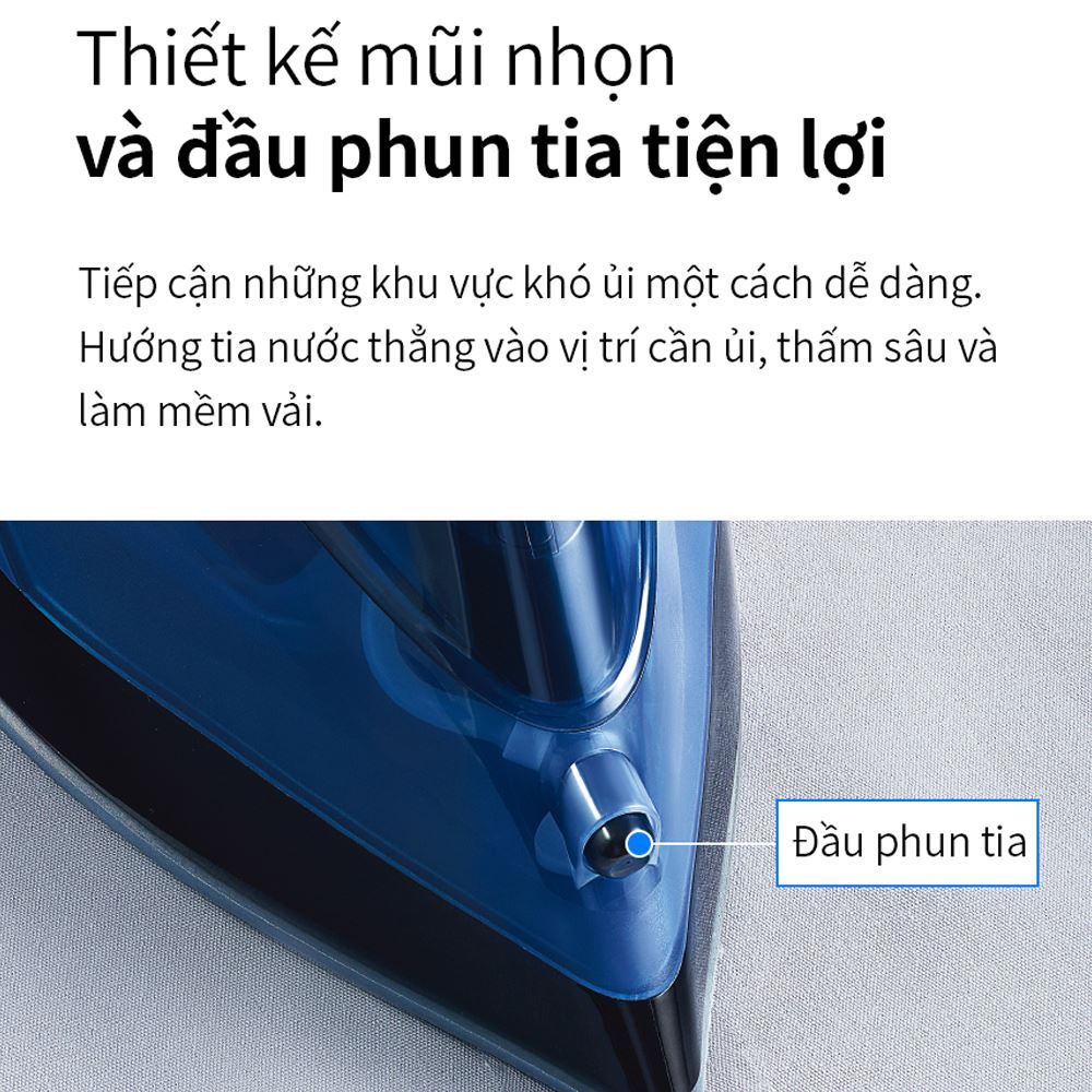 Với thiết kế nhỏ gọn, hiện đại và màu xanh dương bắt mắt, chiếc bàn ủi này không chỉ là một công cụ tiện ích mà còn là điểm nhấn thẩm mỹ cho không gian sống của bạn. Kích thước ngang 29.7 cm - cao 14.2 cm - sâu 12.6 cm cùng khối lượng chỉ 1.25 kg giúp việc cầm nắm và di chuyển bàn ủi trở nên vô cùng nhẹ nhàng, không gây mỏi tay khi sử dụng lâu. Thiết kế mũi nhọn thông minh là một điểm cộng lớn, giúp bạn dễ dàng len lỏi vào những khu vực khó ủi như cổ áo, hàng cúc hay các đường may phức tạp.