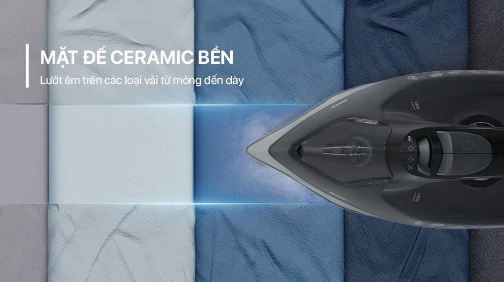 Mặt đế Ceramic chống dính giúp lướt êm trên nhiều chất liệu vải, hạn chế bám sợi và bảo vệ bề mặt quần áo. Sau khi bàn ủi hơi nước nguội, bạn chỉ cần dùng khăn mềm lau nhẹ là có thể vệ sinh sạch sẽ, giữ cho mặt đế luôn sáng bóng và bền đẹp.