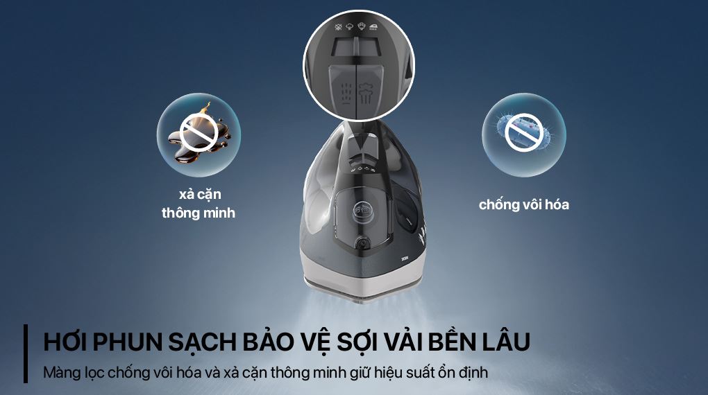 Ngoài chế độ ủi khô, sản phẩm hỗ trợ ủi hơi nước, phun tia và đặc biệt là phun hơi tăng cường giúp làm phẳng nhanh các nếp nhăn cứng đầu. Bạn cũng có thể kích hoạt chế độ xả cặn định kỳ để loại bỏ tạp chất, kết hợp với màng lọc chống vôi hóa nhằm duy trì hơi nước luôn sạch và bảo vệ quần áo khỏi cặn bám.