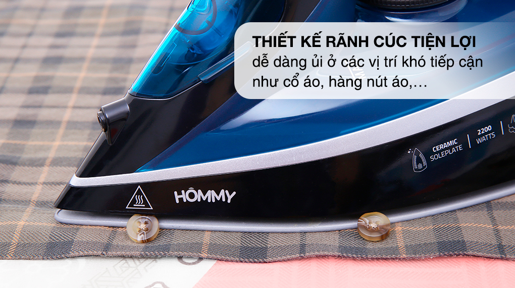 Bàn ủi Hommy thiết kế mũi nhọn, rãnh cúc dễ dàng là ủi ở các vị trí khó tiếp cận trên quần áo như cổ áo, hàng nút áo,…