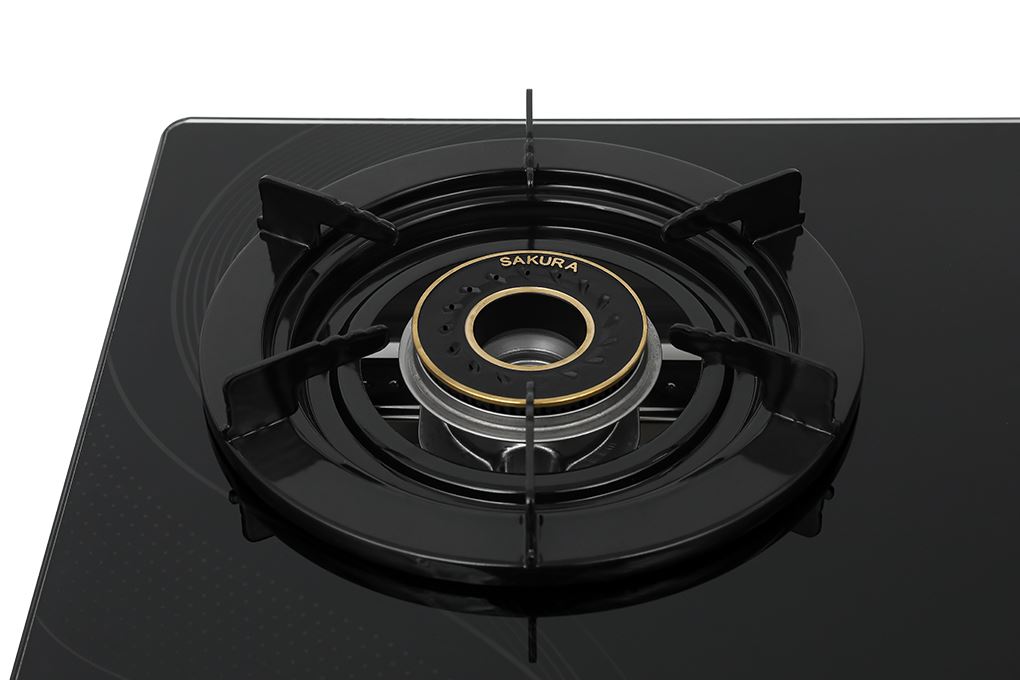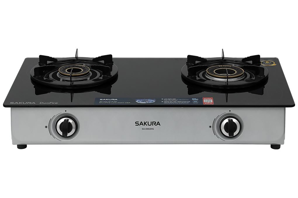 Bếp ga đôi Sakura SA-D802HG thiết kế vuông vức, gọn gàng, màu sắc tối giản, đầu đốt tiết kiệm ga giúp tiết kiệm chi phí.