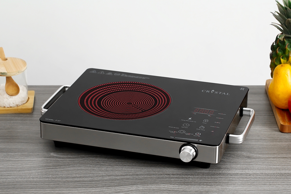 Bếp hồng ngoại Crystal P-27 có công suất 2000W, thiết kế có tay cầm tiện lợi, trang bị sẵn 5 chế độ nấu, có thể điều chỉnh 1 hoặc 2 vòng nhiệt phù hợp với nhiều kích thước nồi, chảo giúp nấu nướng dễ dàng, nhanh chóng.