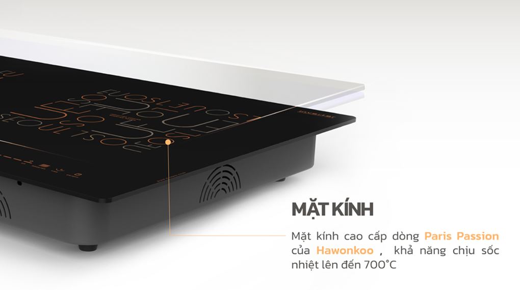 Bếp từ đôi này sử dụng mặt kính cao cấp dòng Paris Passion của Hawonkoo, được sơn phủ bằng công nghệ METALLO STELLARE - công nghệ sơn ô tô độc quyền từ Ý, thường áp dụng cho các dòng xe sang châu Âu.