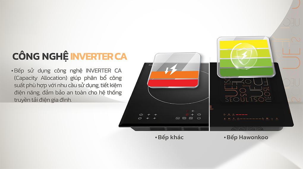 Bếp từ đôi Hawonkoo CEH-286 được trang bị công nghệ Inverer CA (Capacity Allocation) thông minh, giúp phân bổ công suất tối ưu theo nhu cầu sử dụng, giảm tiêu thụ điện năng, và đảm bảo an toàn cho hệ thống điện gia đình. Đặc biệt, khi nấu ở mức công suất nhỏ, bếp vẫn gia nhiệt liên tục, tăng hiệu suất từ trường và tiết kiệm điện năng, mang đến trải nghiệm nấu nướng hiện đại - tiện lợi - tiết kiệm.