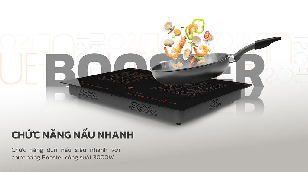 Mỗi vùng nấu đều tích hợp chức năng nấu nhanh với công suất tối đa 3000W, giúp đun nấu nhanh chóng, đặc biệt với các món xào, luộc, nấu. Sau 5 phút, bếp tự động giảm về cấp độ 6 hoặc trở về mức công suất trước đó, kiểm soát nhiệt độ chống trào, tiết kiệm điện năng và giữ nguyên hương vị món ăn.
