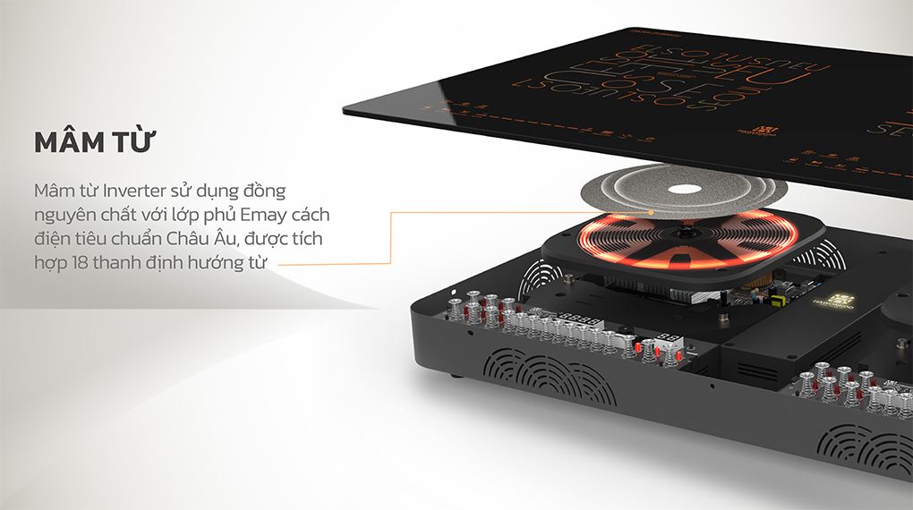 Mâm từ bằng đồng nguyên chất 22 vòng dây, giúp từ tính tập trung, ổn định và gia nhiệt nhanh. Dây đồng phủ lớp emay cách điện chuẩn Châu Âu, đảm bảo an toàn tuyệt đối cho người sử dụng. Hệ thống 18 thanh định hướng từ dưới mâm tập trung nhiệt vào đáy nồi, tỏa nhiệt đều, chống quá nhiệt, bảo vệ linh kiện, nâng cao tuổi thọ bếp và tương thích cả với nồi nhôm đáy từ.