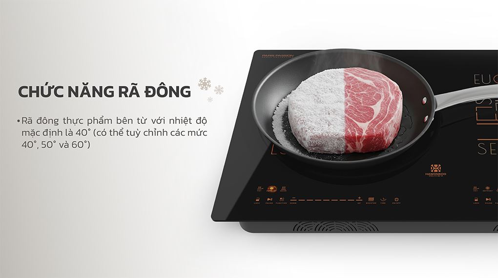 Bếp trang bị chức năng rã đông thông minh với nhiệt độ mặc định 40°C và có thể tùy chỉnh ở các mức 40°, 50°, 60°. Người dùng có thể cài đặt hẹn giờ lên đến 99 phút, sau đó bếp sẽ tự động tắt, đảm bảo an toàn và tiện lợi cho việc chuẩn bị thực phẩm, giữ trọn hương vị và dinh dưỡng.