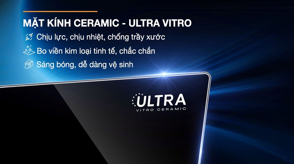 - Mặt bếp được làm từ chất liệu kính Ceramic - Ultra Vitro với khả năng chịu lực, chịu nhiệt tốt và chống trầy xước, giúp dễ dàng vệ sinh sau mỗi lần sử dụng. Không chỉ thế, thiết kế kính vát bo viền kim loại 4 cạnh chắc chắn, giúp nâng đỡ và bảo vệ mặt kính, tránh các nguy cơ gây nứt vỡ khi bị va đập vào mép sản phẩm.