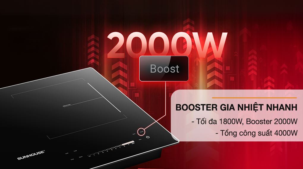 - Với chức năng Booster, vùng nấu từ sẽ hoạt động với công suất 2000W liên tục trong 8 phút để nấu nhanh, sau đó sẽ trở lại công suất được cài đặt trước đó. Chức năng này hỗ trợ đun sôi nhanh chóng, tiết kiệm thời gian.