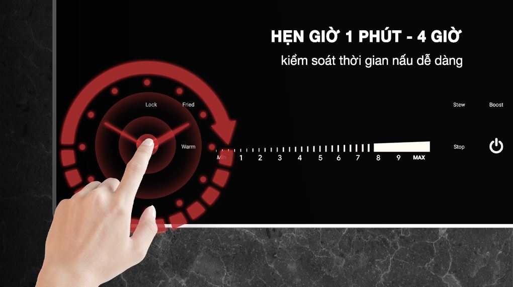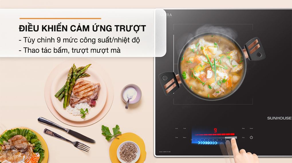 - Bảng điều khiển cảm ứng trượt nhạy giúp dễ dàng điều chỉnh công suất từ mức 1 đến mức 9.