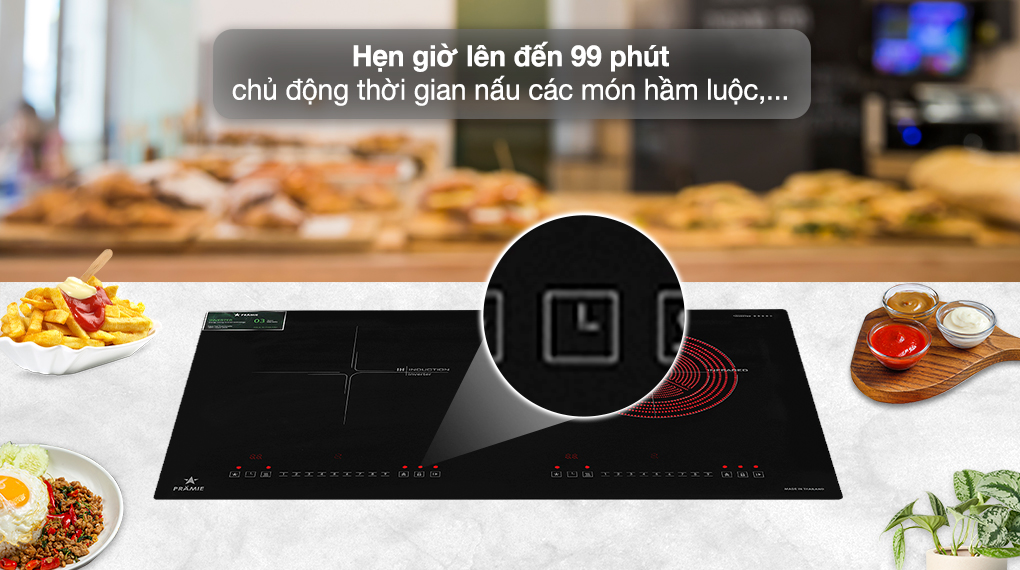 - Tính năng hẹn giờ cho phép cài đặt thời gian nấu tối đa là 99 phút, giúp bạn nấu nướng chủ động linh hoạt thời gian, không cần canh chừng, phù hợp để nấu các món ninh hầm, luộc,...