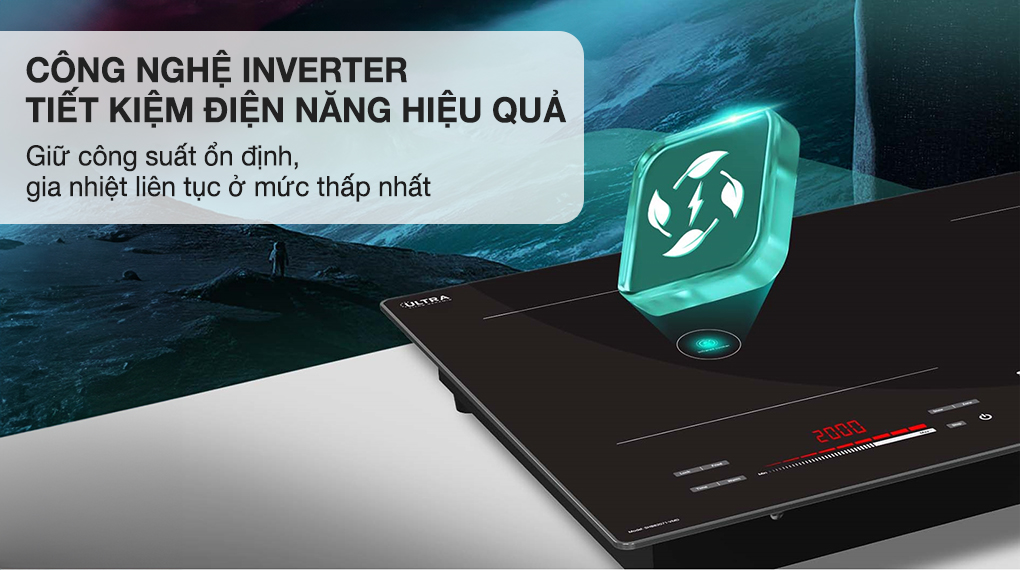 - Công nghệ Inverter thay đổi mức công suất tiêu thụ phù hợp với dụng cụ nấu và dòng điện. Nhờ đó mà bếp có thể gia nhiệt liên tục (nấu sôi liu riu) ở mức công suất thấp, kể cả mức 1.