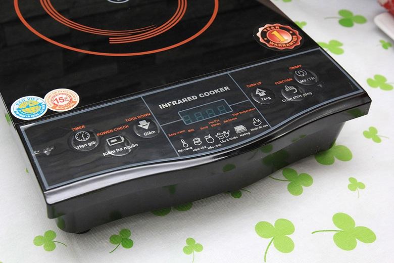 Bếp điện được trang bị bảng điều khiển nút nhấn điện tử hiện đại có hướng dẫn tiếng Việt cùng màn hình LCD hiển thị thời gian và nhiệt độ nấu, giúp người sử dụng thao tác với sản phẩm dễ dàng và chính xác (Xem thêm Ưu điểm của bảng điều khiển nút nhấn điện tử).