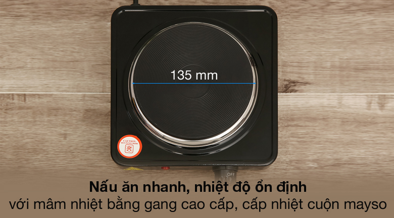 Đường kính mâm nhiệt 135 mm dễ dùng với nồi chảo cỡ nhỏ và trung. Bếp hoạt động an toàn, tiết kiệm điện với cơ chế cấp nhiệt cuộn dây mayso đơn giản, bền bỉ, dễ dùng.