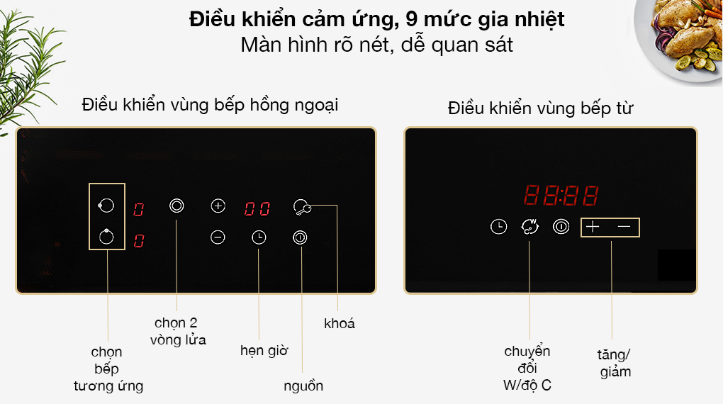 - Cảnh báo mặt bếp nóng qua đèn báo hiệu trên bảng điều khiển