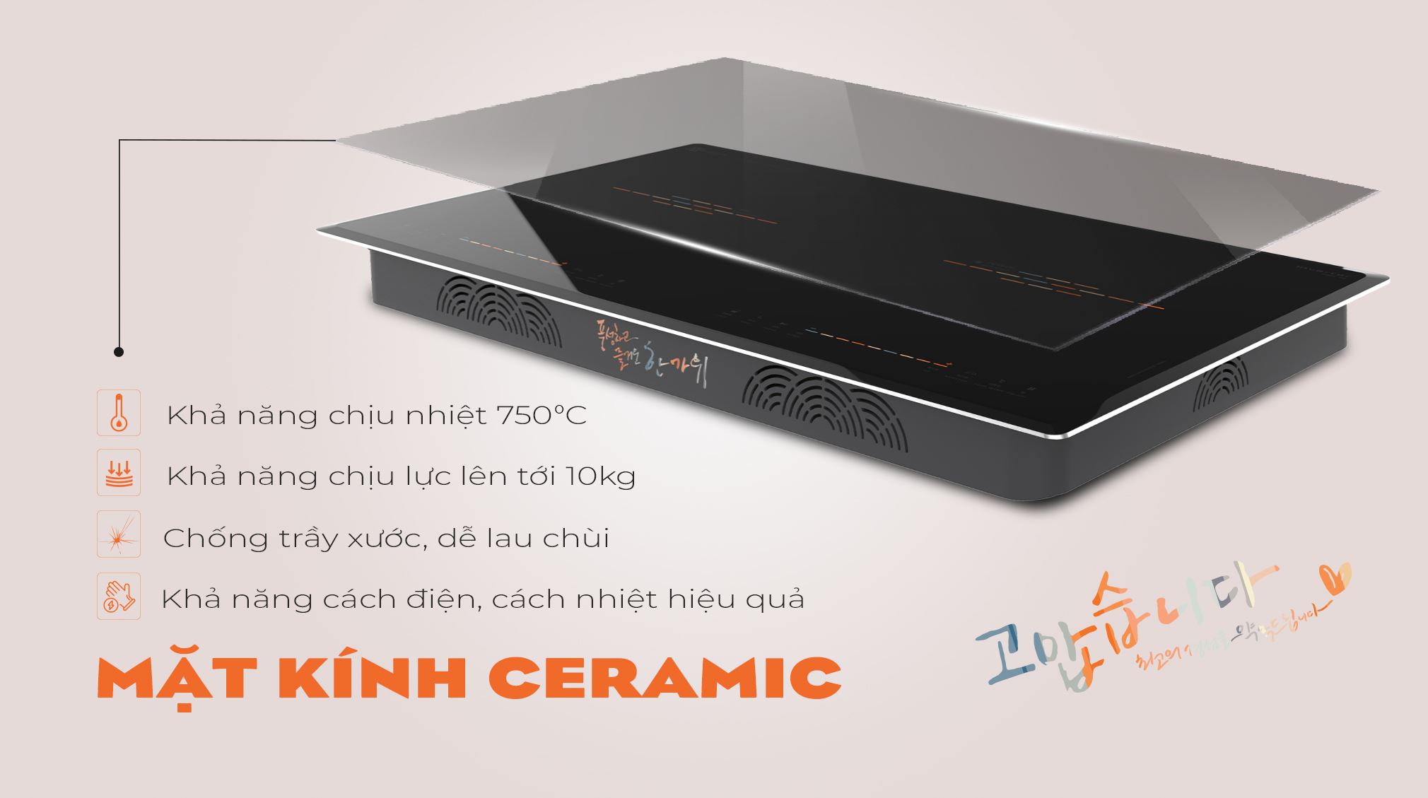 - Mặt bếp được làm từ kính Ceramic chịu lực, chịu nhiệt tốt. Chất liệu sáng bóng dễ lau chùi, khả năng chống trầy xước tốt, ổn định hiệu suất đun nấu trong suốt thời gian sử dụng.