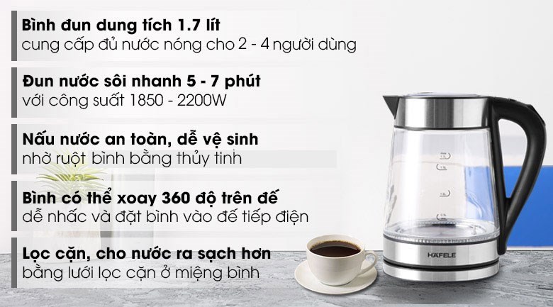 Hafele tích hợp nhiều tiện ích như đèn LED báo hiệu, lưới lọc trà hoặc lọc cặn giúp pha chế sạch hơn. Đế xoay 360 độ hỗ trợ đặt bình ở mọi góc thuận tiện. Một số model cao cấp còn có chế độ giữ ấm, cho phép điều chỉnh nhiệt độ linh hoạt khi pha trà, pha sữa hoặc giữ nước nóng lâu hơn.