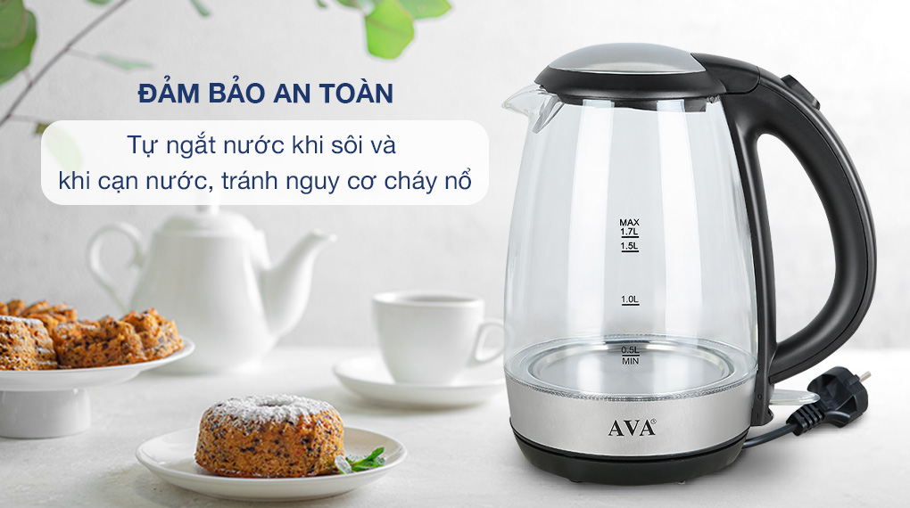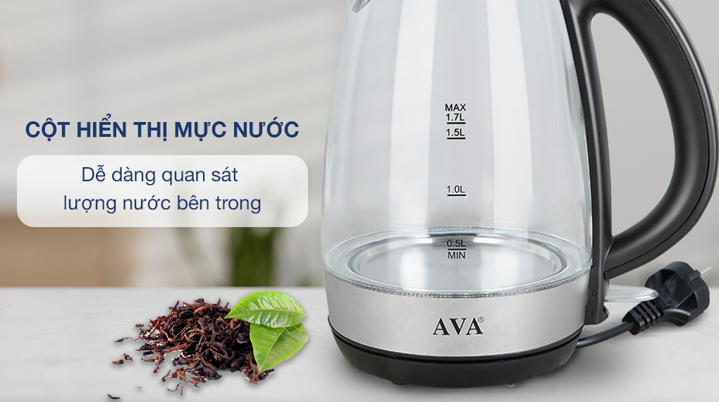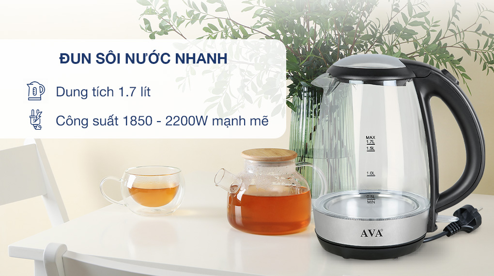 Bình đun siêu tốc AVA KEGS5801B-GS dung tích 1.7 lít, công suất 1850 - 2200W, tự ngắt khi nước sôi/cạn nước, có lưới lọc cặn,... đáp ứng tốt nhu cầu sử dụng của mỗi gia đình trong việc pha trà, cà phê,...