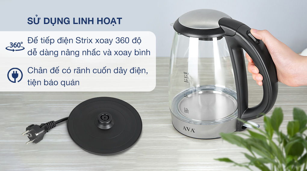 - Bật/tắt bình đun siêu tốc AVA bằng công tắc, có trang bị đèn báo hoạt động, được gắn vòng quanh phần đáy bình.