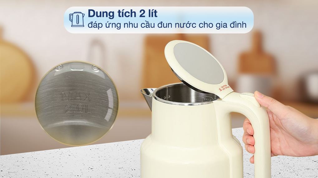 Dung tích 2 lít đáp ứng nhu cầu đun nước nóng cho gia đình nhiều người hoặc sử dụng trong văn phòng nhỏ.