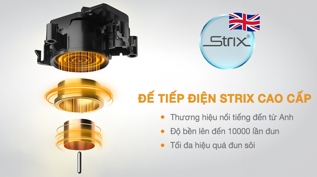 - Đế tiếp điện Strix đến từ Anh với độ bền lên đến 10000 lần đun sôi, kiểm soát nhiệt độ chính xác. Ngoài ra đế hỗ trợ xoay 360 độ dễ dàng nhấc bình lên và đặt ở mọi góc, thuận tiện khi sử dụng.