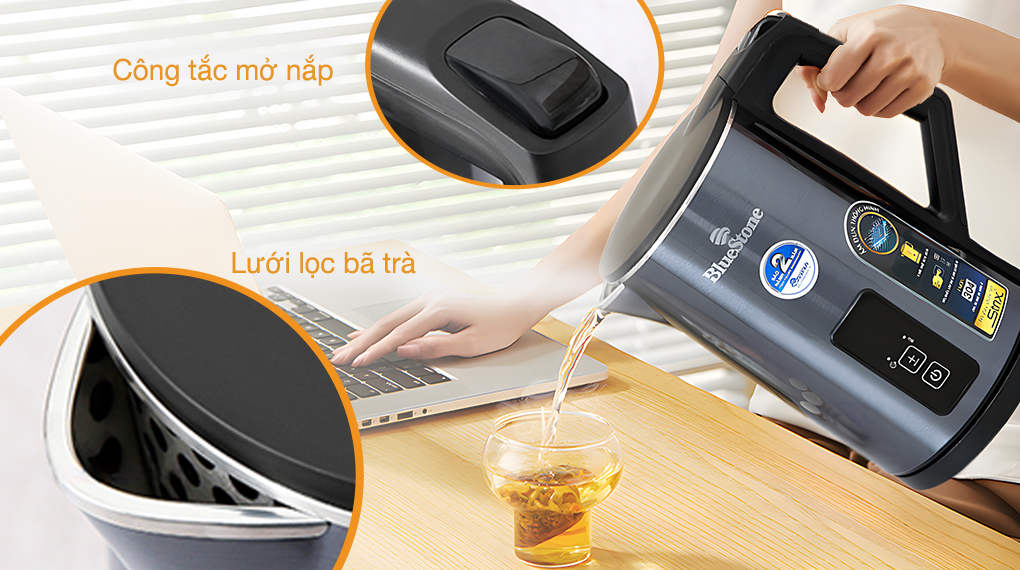 - Bình đun siêu tốc BlueStone có khả năng điều chỉnh 6 mức nhiệt độ đáp ứng được đa dạng nhu cầu sử dụng nước ấm, nước nóng.
