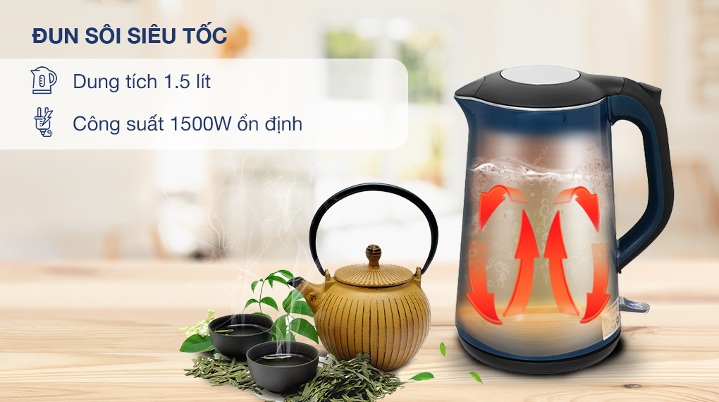 - Dung tích 1.5 lít, giúp bạn luôn có sẵn nước sôi để phục vụ nhu cầu uống cafe, pha trà, nấu ăn,… tiện lợi.