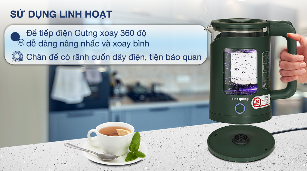 - Đế tiếp điện Gutng bền bỉ với tuổi thọ lên đến khoảng 5000 lần đun sôi, hỗ trợ xoay 360 độ, dễ dàng nhấc bình lên và đặt ở mọi góc nhờ thiết kế chân đế rời, thuận tiện khi sử dụng.