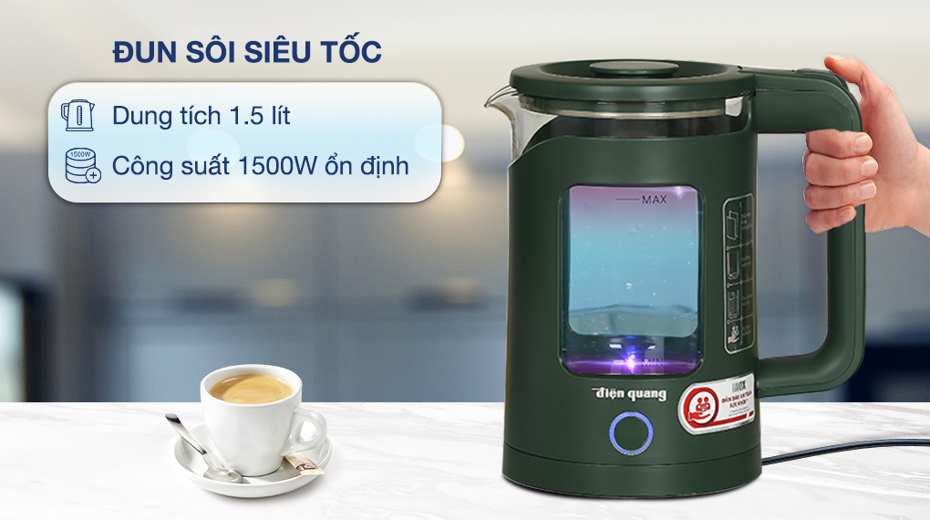 Bình đun siêu tốc Điện Quang 1.5 lít ĐQ EKT16 1515 MG có ruột bình thủy tinh chịu nhiệt bền tốt, đun sôi nước nhanh với công suất 1500W, trang bị nhiều tiện ích và chế độ an toàn, đảm bảo đáp ứng nhu cầu sử dụng nước nóng của gia đình.