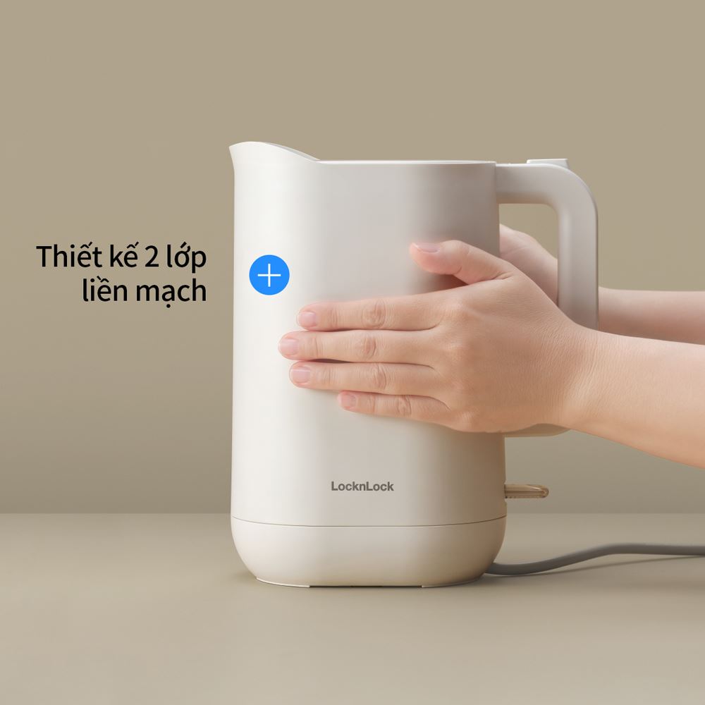 Vỏ bình được làm từ nhựa PP cao cấp, với thiết kế hai lớp liền mạch, giúp giữ bề mặt ngoài luôn mát dù nước bên trong đang sôi, bảo vệ người dùng khỏi nguy cơ bỏng. Đặc biệt, lòng ấm được phủ lớp gốm cao cấp, một cải tiến đáng giá giúp loại bỏ hoàn toàn mùi vị kim loại hay nhựa khó chịu, đảm bảo hương vị tinh khiết cho đồ uống. Lớp phủ này còn hạn chế sự tích tụ cặn, giúp việc vệ sinh trở nên đơn giản và nhanh chóng hơn bao giờ hết, góp phần kéo dài tuổi thọ cho ấm siêu tốc Lock&Lock.
