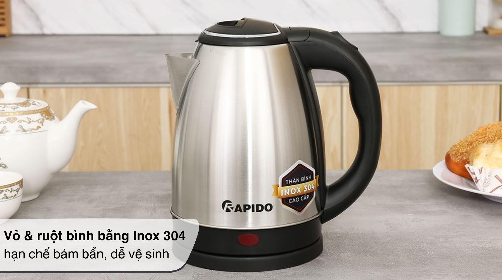 Bình đun siêu tốc Rapido 1.8 lít RK-1815-3 dùng Inox 304 cho cả vỏ ngoài và ruột bình, bề mặt sáng, chắc chắn, hạn chế bám bẩn, sau khi sử dụng chỉ cần lau nhẹ là sạch. Tay cầm được tách biệt với thân inox, giúp cầm nắm khi rót nước nóng yên tâm hơn.