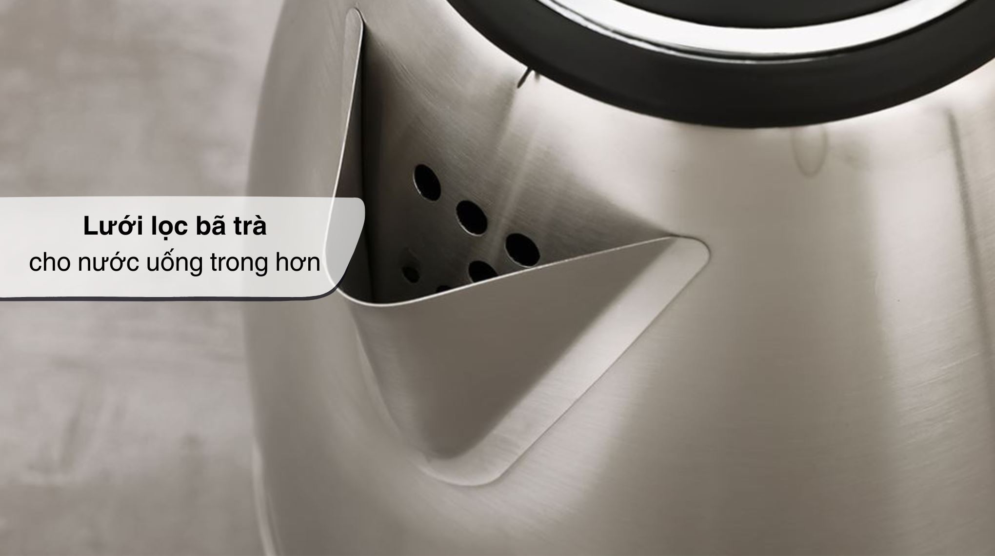 Công tắc hoạt động bố trí gần tay cầm, đi kèm đèn báo giúp dễ nhận biết bình đang đun. Miệng rót có lưới lọc hỗ trợ giữ lại bã trà hoặc cặn lớn.