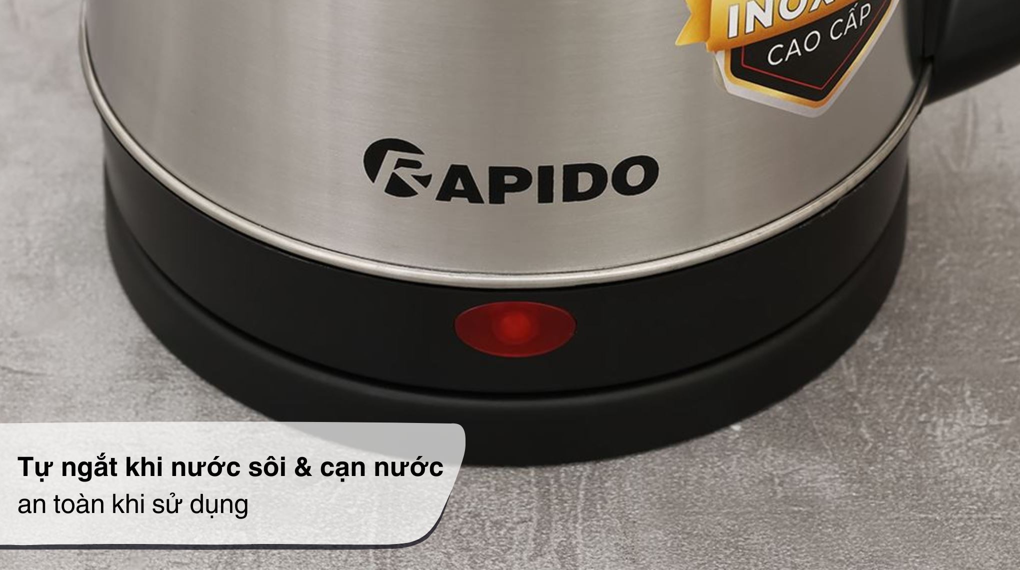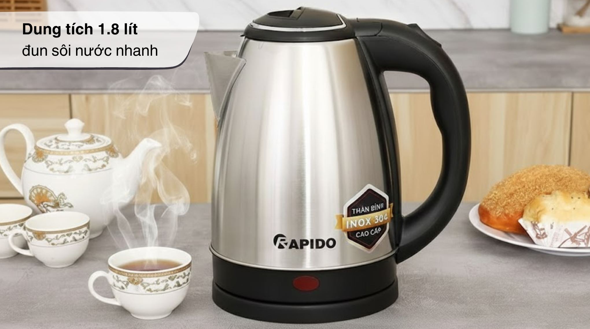 Bình đun siêu tốc Rapido 1.8 lít RK-1815-3 phù hợp gia đình nhỏ, sinh viên, nhân viên văn phòng hay pha trà, cà phê, mì; thiết kế Inox 304 bền, công suất 1500W đun nhanh, tự ngắt khi sôi và khi cạn giúp dùng an toàn hơn.